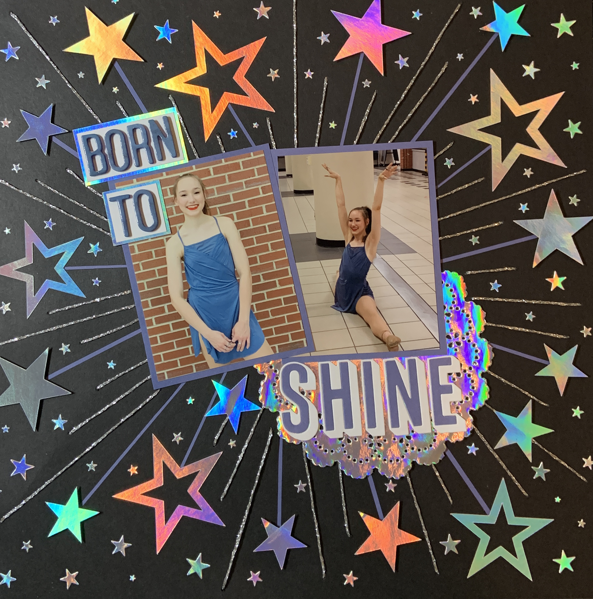 I popped up the larger solid stars using black foam tape. After gluing the rest of the stars to the black cardstock, I used a ruler and a pencil to draw in the rest of the lines in between the stars and radiating out from the center of the layout. I used an embroidery needle and silver sparkle twine to stitch over the pencil-marked lines. I filled in the rest of the spaces with assorted sizes of holographic stars die cut from the Tim Holtz Falling Stars Thinlit die set. I found a piece of purple cardstock that matched my daughter's dance costume and adhered it behind the piece of black 12x12 cardstock so that the purple paper would show through the larger starburst lines that were cut using the Cricut machine.